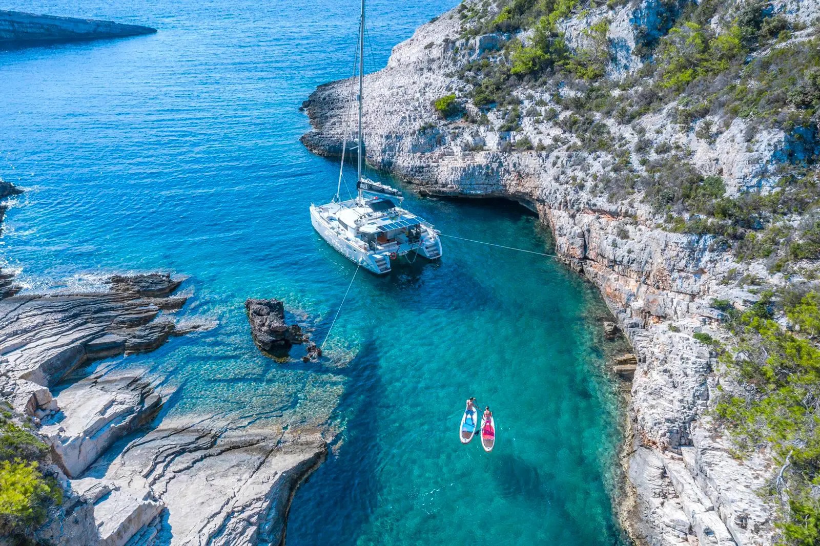 Passerete l’80 del tempo del tempo all’ancora. Per dormire sonni tranquilli, usate sempre due cime che partono dalle prue e si collegano alla catena. Questo evita che la catena sforzi sul verricello e impedisce alla barca di sbandare a destra e sinistra come un pendolo. E se volete la baia tutta per voi, imparate a portare una cima a terra: vi permetterà di restare immobili in posti meravigliosi dove altri non possono fermarsi.